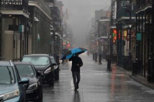 FILE PHOTO: A pedestrian walks down Bourbon Street as the effects of Hurricane Francine begin to be felt in New Orleans, Louisiana, U.S. September 11, 2024. REUTERS/Edmund D. Fountain/File Photo