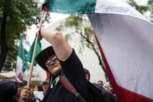 A person waves a Mexican flag as demonstrators protest on Paseo de la Reforma Avenue after a highly contested judicial reform proposal was passed in the Senate in Mexico City, Mexico September 11, 2024. REUTERS/Toya Sarno Jordan