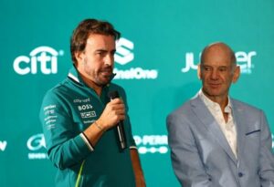 FOTO DE ARCHIVO: Fernando Alonso de Aston Martin con su nuevo socio técnico Adrian Newey durante la rueda de prensa de la escudería de Fórmula Uno en el AMR Technology Campus de Silverstone, Reino Unido. 10 de septiembre, 2024. Action Images via Reuters/Andrew Boyers/Archivo
