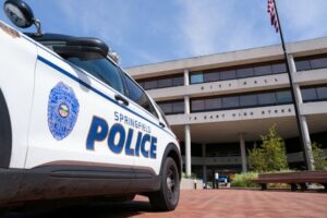 A police car sits outside Ohio City Hall which, according to the city government, received a bomb threat and was evacuated Thursday morning, in Springfield, Ohio, U.S., September 12, 2024. REUTERS/Julio-Cesar Chavez