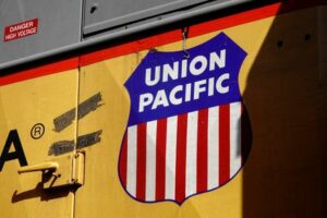 FILE PHOTO: Union Pacific livery on the side of a cargo locomotive is pictured at Union Station in Los Angeles, California, U.S., September 15, 2022. REUTERS/Bing Guan/File Photo