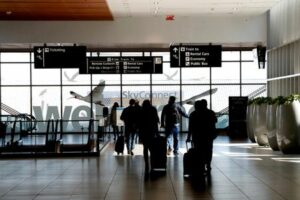 Airline passengers walk inside the Tampa International Airport in Tampa, Florida, U.S., January 19, 2022. REUTERS/Octavio Jones/File Photo