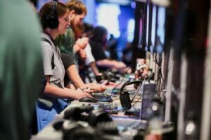 FILE PHOTO: Visitors play a game during the 2024 Gamescom computer and video game industry event in Cologne, Germany, August 21, 2024. REUTERS/Jana Rodenbusch/File Photo