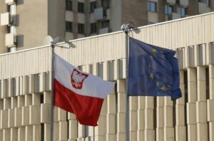 FILE PHOTO: Flags of Poland and European Union fly outside the Polish embassy in Moscow, Russia March 29, 2018. REUTERS/Maxim Shemetov/File Photo