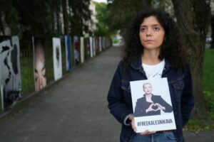 FILE PHOTO: Tatsiana Khomich, sister of imprisoned Belarus opposition leader Maria Kalesnikava, looks on during an interview in Vilnius, Lithuania August 2, 2024. REUTERS/Janis Laizans/File Photo