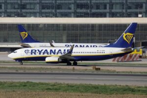 Two Boeing 737-8AS passenger aircrafts of Ryanair airline, taxi on