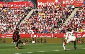 Lamine Yamal del Barcelona marca su primer gol ante Paulo Gazzaniga del Girona en un partido por LaLiga española de fútbol en el Estadio Montilivi de Girona, España. 15 de septiembre, 2024. REUTERS/Albert Gea