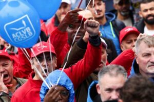 People shout slogans as workers and trade unions take part in a demonstration in support of Audi workers after Volkswagen warned it may close the Brussels site of its luxury brand Audi in Brussels, Belgium September 16, 2024. REUTERS/Yves Herman
