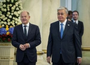 Der kasachische Präsident Kassym-Jomart Tokajew und der deutsche Bundeskanzler Olaf Scholz nehmen an einer offiziellen Begrüßungszeremonie teil, in Astana, Kasachstan, am 16. September 2024. REUTERS/Turar Kazangapov