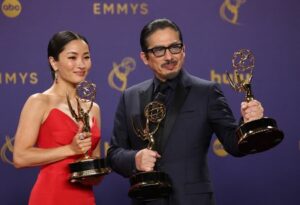 Anna Sawai, ganadora del premio a la Actriz Protagonista Destacada en una Serie Dramática e Hiroyuki Sanada, al Actor Protagonista Destacado en una Serie Dramática por «Shogun» en la 76ª edición de los premios Primetime Emmy en Los Ángeles, California, Estados Unidos, el 15 de septiembre de 2024. REUTERS/Mike Blake.