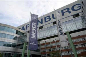 ARCHIV: Fahnen flattern vor dem Gebäude der Meyer Werft am Tag des Besuchs von Bundeskanzler Olaf Scholz (nicht im Bild) in Papenburg, Deutschland, am 22. August 2024. REUTERS/Carmen Jaspersen