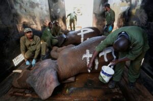 Kenya Wildlife Service (KWS) rangers mark tranquilized elephants to identify them during a translocation exercise from the Mwea National Reserve to the Aberdare National Park, in Embu County, Kenya October 14, 2024. REUTERS/Thomas Mukoya