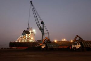 FILE PHOTO: A crane is used to unload coal from a cargo ship at the Deendayal Port in Kandla, in the western state of Gujarat, India, September 25, 2024. REUTERS/Amit Dave/File Photo