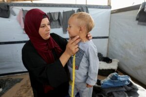A Palestinian woman measures a displaced child to create winter clothes from blankets amid clothing shortages, at a tent in Khan Younis in the southern Gaza Strip, October 26, 2024. REUTERS/Ramadan Abed