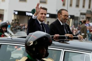 French President Emmanuel Macron greets the crowd as he tours with Morocco’s King Mohammed VI on the first day of a state visit by the French president, in Rabat, Morocco October 28, 2024. REUTERS/Stringer