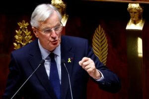 FILE PHOTO: French Prime Minister Michel Barnier delivers a speech during a censure motion debate filed by the alliance of left-wing parties the “Nouveau Front Populaire” (New Popular Front – NFP), after the questions to the government session at the National Assembly in Paris, France, October 8, 2024. REUTERS/Stephanie Lecocq/File Photo