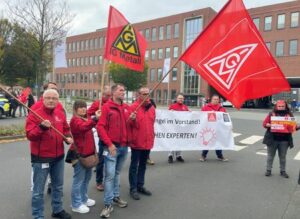 Arbeiter des Volkswagenwerks Kassel-Baunatal des größten europäischen Automobilherstellers Volkswagen AG schwenken Fahnen der mächtigen deutschen IG Metall nach einer Unterrichtung des Betriebsrats über die Pläne von VW, drei Werke zu schließen und Tausende von Mitarbeitern zu entlassen, in Baunatal bei Kassel, Deutschland, 28. Oktober 2024. REUTERS/Timm Reichert