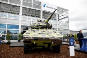 FILE PHOTO: People stand near a Rheinmetall Boxer Skyranger at the International Aerospace Exhibition ILA on the opening day at Schoenefeld Airport in Berlin, Germany June 5, 2024. REUTERS/Axel Schmidt/File Photo