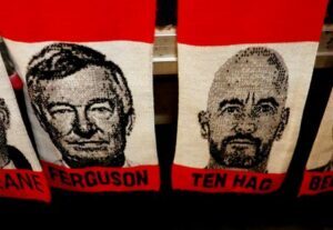 FILE PHOTO: Soccer Football – Champions League – Group A – Manchester United v Bayern Munich – Old Trafford, Manchester, Britain – December 12, 2023 General view of a scarfs with pictures of former Manchester United manager Sir Alex Ferguson and Manchester United manager Erik ten Hag for sale outside the stadium before the match REUTERS/Carl Recine/File Photo