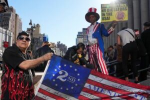 A supporter and an opponent of Republican presidential nominee and former U.S. President Donald Trump pose for a picture on the day of a rally that will be held in Madison Square Garden, in New York, U.S., October 27, 2024. REUTERS/David Dee Delgado