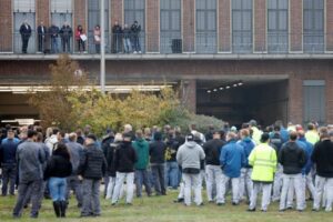 Daniela Cavallo, Chairwoman of the General and Group Works Council of Volkswagen AG, speaks to employees announcing job cuts and closure of a few Volkswagen factories, at the company’s headquarters in Wolfsburg, Germany, October 28, 2024. REUTERS/Axel Schmidt