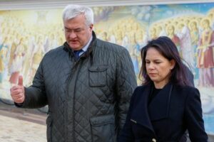 German Foreign Minister Annalena Baerbock and Ukrainian Foreign Minister Andrii Sybiha walk in front of Saint Michael’s Cathedral, amid Russia’s attack on Ukraine, in Kyiv, Ukraine November 4, 2024. REUTERS/Valentyn Ogirenko
