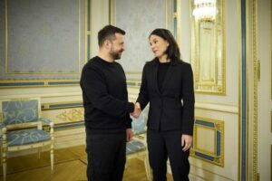 Der ukrainische Präsident Wolodymyr Zelenskiy begrüßt die deutsche Außenministerin Annalena Baerbock vor ihrem Treffen, in Kiew, Ukraine 4. November 2024. Ukrainian Presidential Press Service/Handout via REUTERS ATTENTION EDITORS – THIS IMAGE HAS BEEN SUPPLIED BY A THIRD PARTY.