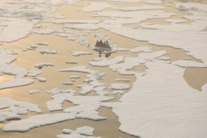 A boat with people wades through the toxic foams in the polluted Yamuna river on a smoggy morning in New Delhi, India, November 5, 2024. REUTERS/Anushree Fadnavis
