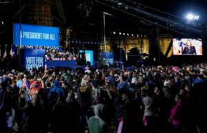 Democratic presidential nominee and U.S. Vice President Kamala Harris speaks during a campaign rally at Carrie Blast Furnaces National Historic Landmark, in Pittsburgh, Pennsylvania, U.S., November 4, 2024. REUTERS/Elizabeth Frantz
