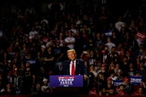 Republican presidential nominee and former U.S. President Donald Trump speaks during a campaign rally in Grand Rapids, Michigan, U.S., November 5, 2024. REUTERS/Emily Elconin