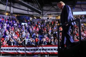 Republican presidential nominee and former U.S. President Donald Trump steps off the stage following his campaign rally at Santander Arena in Reading, Pennsylvania, U.S., November 4, 2024. REUTERS/Brian Snyder