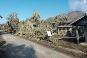 A general view of a residential area covered with volcanic ash at an area affected by the eruption of Mount Lewotobi Laki-Laki volcano at Flores Timur, Indonesia, November 4, 2024. Antara Foto/Pemulet Paul/via REUTERS