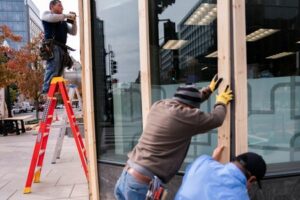 Workers cover the windows of a pharmacy near the White House with plywood ahead of the U.S. presidential election in Washington, U.S., November 4, 2024. REUTERS/Nathan Howard
