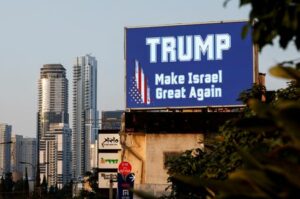 A billboard shows a slogan in support of Republican presidential nominee and former U.S. President Donald Trump, on the day of 2024 U.S. presidential election, in Tel Aviv, Israel, November 5, 2024. REUTERS/Thomas Peter