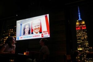 People attend a watch party at 230 Fifth Rooftop Bar, as the Empire State Building is seen in the background, in New York City, U.S., November 5, 2024. REUTERS/Andrew Kelly