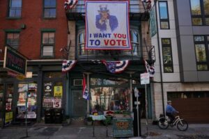 Una pancarta electoral que representa al «Tío Sam» cuelga de un edificio durante las elecciones presidenciales estadounidenses de 2024 el día de las elecciones en Filadelfia, Pensilvania, Estados Unidos, 5 de noviembre de 2024. REUTERS/Seth Herald