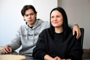 Ukrainian teenager Roman Biletskyi, 18, sits with his mother Svitlana Biletska ,41, during a meeting with family, in Kosice, Slovakia, October 21, 2024. Roman Biletskyi has been living alone without his family in Slovakia for more than a year, where he left before turning 18, when they are banned from traveling abroad due to the war. He met his family months later, when they came to visit him in Kosice. REUTERS/Radovan Stoklasa