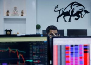 FILE PHOTO: A broker reacts as he trades at his computer terminal inside a stock brokerage firm in Mumbai, India, July 23, 2024. REUTERS/Francis Mascarenhas/File Photo