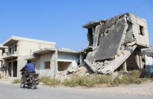 FOTO DE ARCHIVO. Un hombre pasa en moto por delante de un edificio dañado en Homs, Siria. 7 de noviembre de 2024. REUTERS/Firas Makdesi
