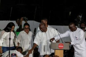 Ghana’s President-elect John Dramani Mahama shakes hands with a member of his staff, as he is about to address his supporters, after the electoral commission declared him winner of the presidential election, in Accra, Ghana December 9, 2024. REUTERS/Zohra Bensemra