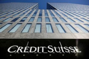 FILE PHOTO: The logo of Credit Suisse is pictured on a building near the Hallenstadion in Zurich, Switzerland, April 4, 2023. REUTERS/Pierre Albouy/File Photo
