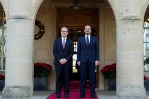 Britain’s Prime Minister Keir Starmer is welcomed by Cyprus’ President Nikos Christodoulides at the Presidential Palace in Nicosia, Cyprus, Tuesday, Dec. 10, 2024. Kirsty Wigglesworth/Pool via REUTERS