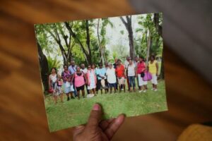 Lucienne Sagaie holds an image of Lucie Tiatous (far left) taken during her visit to Chagos in 2010, in Crawley, Britain, December 4, 2024. REUTERS/Hollie Adams