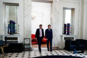 French President Emmanuel Macron walks next to First Secretary of the Socialist Party (PS) Olivier Faure after their meeting at the Elysee Palace in Paris, France, June 21, 2022. Mohammed Badra/Pool via REUTERS/File Photo