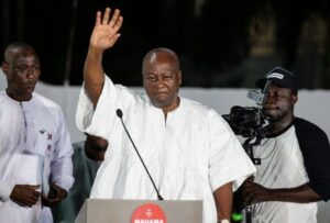Ghana’s President-elect John Dramani Mahama waves to his supporters, after the electoral commission declared him winner of the presidential election in Accra, Ghana, December 9, 2024. REUTERS/Zohra Bensemra