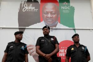 Police officers stand guard as supporters of Ghana’s main opposition National Democratic Congress (NDC) party arrive at the office premises of ex-president John Dramani Mahama, in Accra, Ghana December 9, 2024. REUTERS/Francis Kokoroko