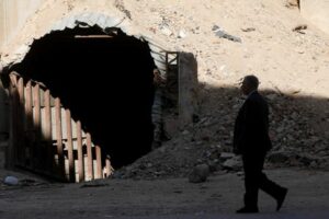 A man walks past a shelter used by residents to protect themselves from attacks in Douma, where a suspected chemical attack took place in 2018 under the rule of Syria’s Bashar al-Assad, following the ousting of al-Assad, Syria, December 14, 2024. REUTERS/Yamam Alshaar