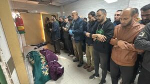 People pray next to the dead bodies of Palestinians at Kamal Adwan hospital, during the ongoing Israeli military operation, amid Israel-Hamas conflict, in Beit Lahiya, in the northern Gaza Strip, December 17, 2024. REUTERS/Stringer