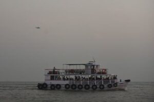 A military helicopter flies over a ferry during a rescue operation after a passenger boat capsized off the coast of India’s financial capital Mumbai, India, December 18, 2024. REUTERS/Stringer