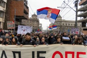 A student waves a flag, as others hold banners and chant slogans during a protest, demanding action from the state prosecutor in the case of the deaths of the victims in the Novi Sad railway station disaster in November, in Belgrade, Serbia, December 25, 2024. REUTERS/Djordje Kojadinovic